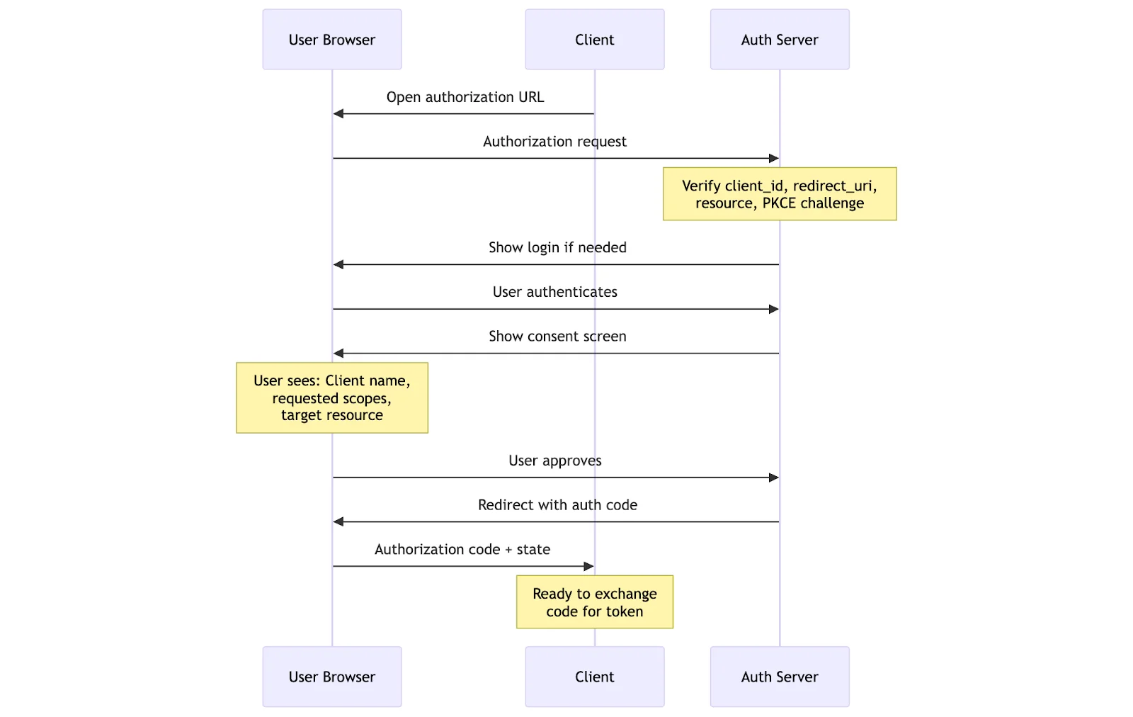 The beauty of this division of labor is that each party can focus on its core competency. The MCP server doesn't need to handle user authentication or consent flows; it just validates tokens. The client doesn't need to understand the server's permission model; it just obtains and presents tokens. The authorization server handles all the messy user interaction and consent management, keeping that complexity out of the MCP protocol itself.